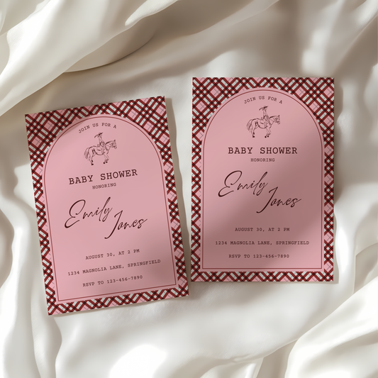 Baby Shower Invitation - Equestrian Preppy Pink Plaid BS128