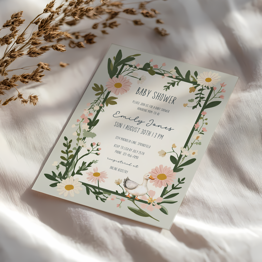 Baby Shower Invitation - Floral Goose Spring Daisies Vintage Green BS124