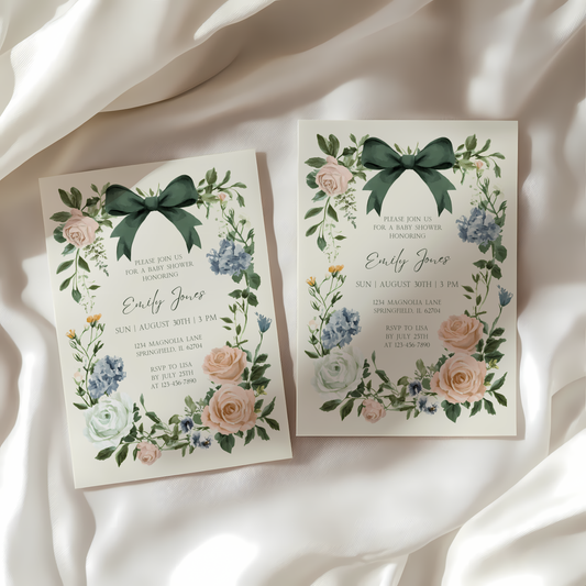 Baby Shower Invitation - Vintage Floral Elegant French Garden Party Green Bow BS126