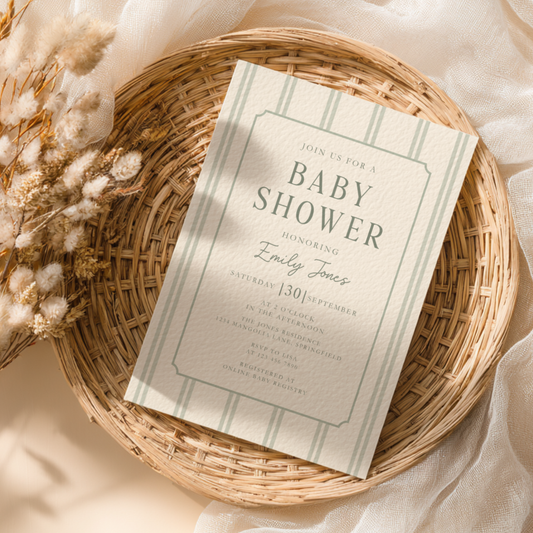Sage Green Striped Baby Shower Invitation BS275