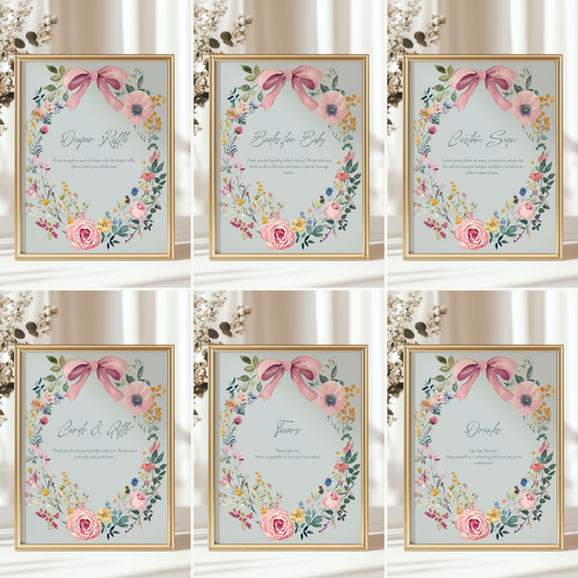 Baby Shower Table Sign Bundle - Blush Pink Baby In Bloom Vintage Floral Bow BS71
