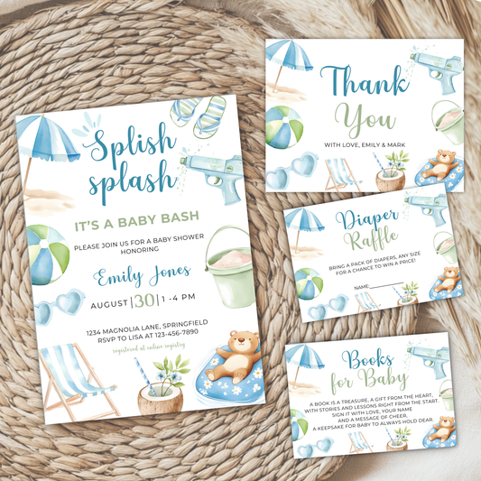 Baby Shower Invitation Bundle - Blue Splish Splash Baby Bash Pool Party Beach BS142