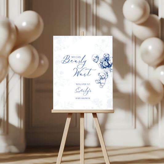 Baby Shower Welcome Sign - Blue Bearly Wait Toile de Jouy BS35