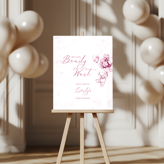 Baby Shower Welcome Sign - Pink Bearly Wait Toile de Jouy BS37