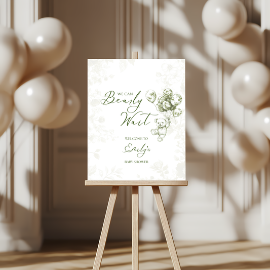 Baby Shower Welcome Sign - Green Bearly Wait Toile de Jouy BS38