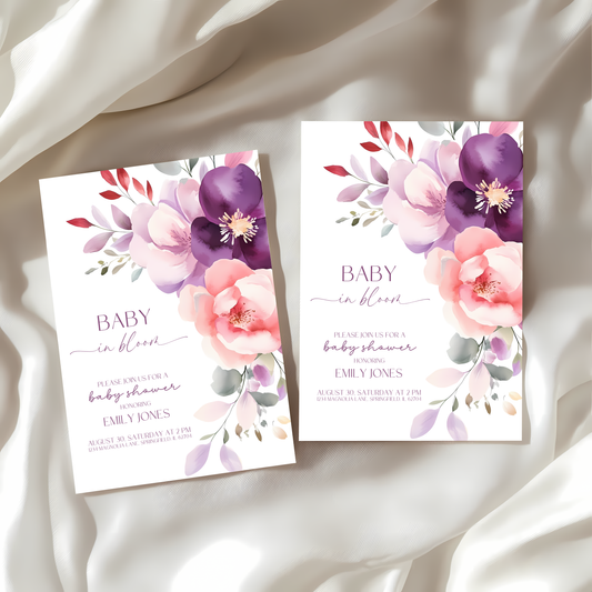 Baby Shower Invitation - Baby In Bloom Pink Purple Flowers BS46