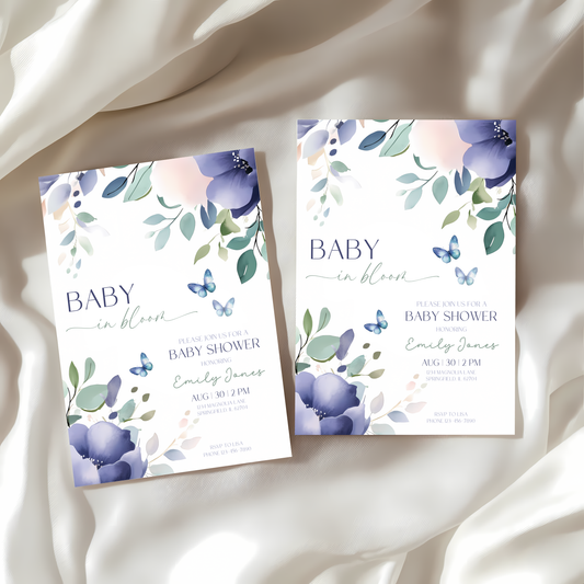 Baby Shower Invitation - Baby In Bloom Blue Green Flowers Butterflies BS47