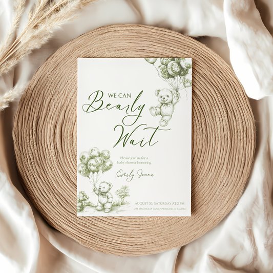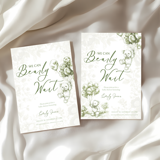 Baby Shower Invitation - Green Bearly Wait Toile de Jouy BS38
