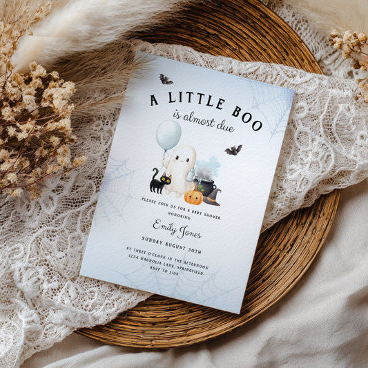 Baby Shower Invitation - Little Boo Is Almost Due Blue Halloween Baby Ghost BS190