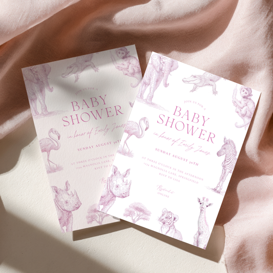 Baby Shower Invitation - Pink Safari Toile de Jouy with Animals Zebra Rhino Giraffe Elephant BS186