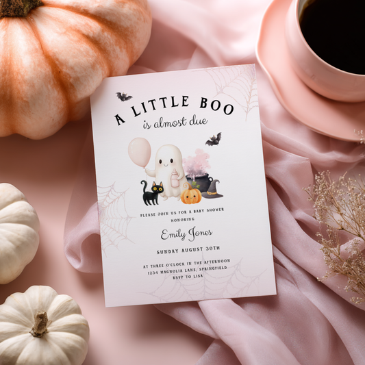 Baby Shower Invitation - A Little Boo is Almost Due Pink Halloween BS190