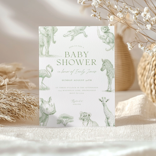 Baby Shower Invitation - Green Toile Safari with Animals Elephant Rhino Giraffe BS186