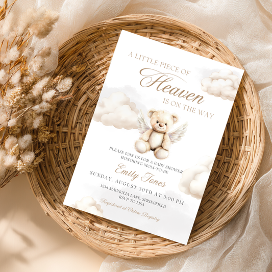 Baby Shower Invitation - Little Piece Of Heaven Bear with Angel Wings BS172