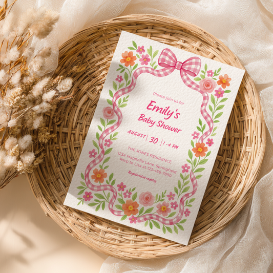Baby Shower Invitation - Pink Gingham Bow Floral Baby In Bloom BS171