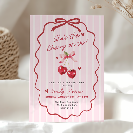 Baby Shower Invitation - She's The Cherry On Top Pink Coquette Bow BS177