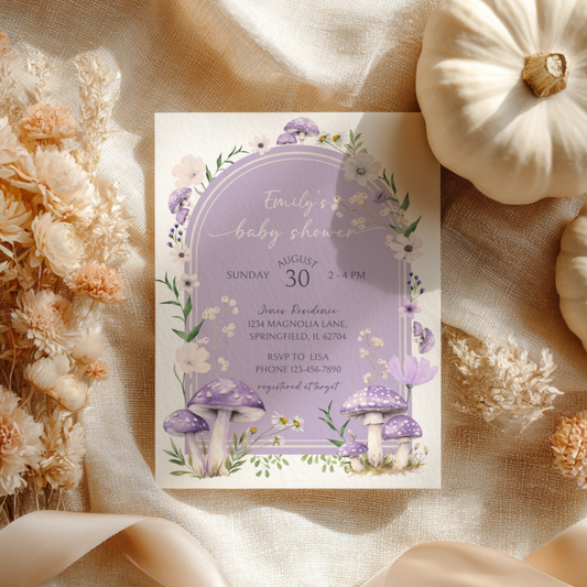 Baby Shower Invitation - Mushroom Magical Woodland Lavender Lilac Enchanted Forest BS82