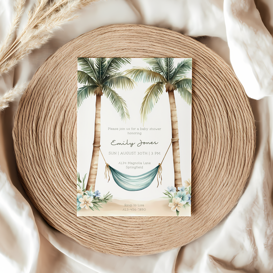 Baby Shower Invitation - Tropical Paradise Beach Hammock & Palm Trees BS140