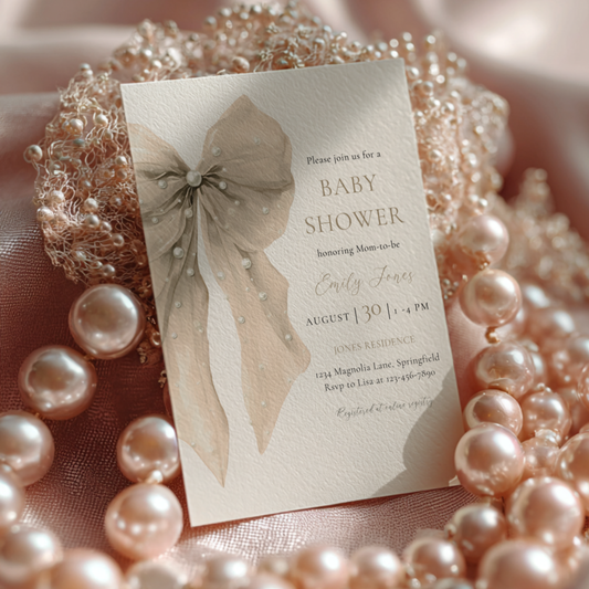 Baby Shower Invitation - Beige Coquette Bow with Pearls BS164