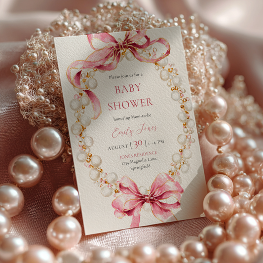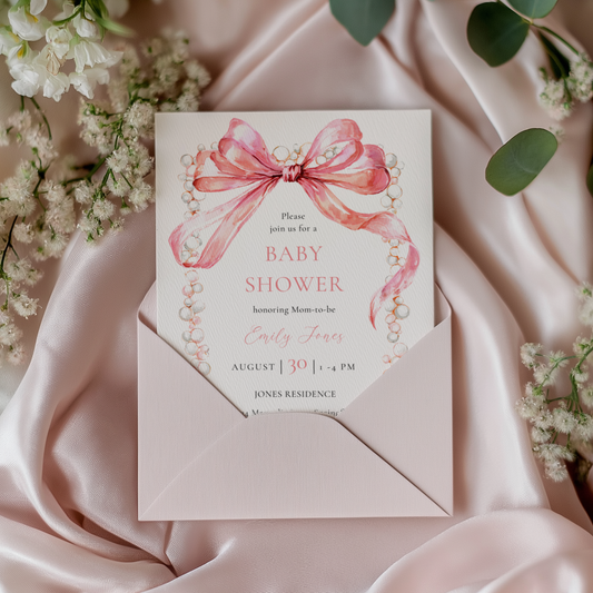 Baby Shower Invitation - Pink Bow with Coquette Pearls BS164