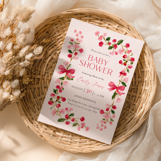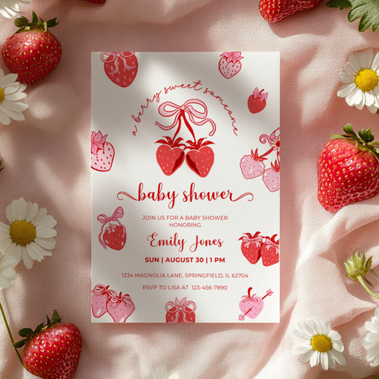 Baby Shower Invitation - Cute Strawberry Berry Sweet Coquette Pink Red Bow BS152