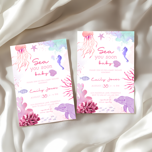 Baby Shower Invitation - Pink Under The Sea Animals Sea You Soon BS158