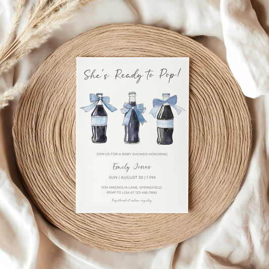 Baby Shower Invitation - Blue She's Ready To Pop Red Retro Soda with Bows BS153