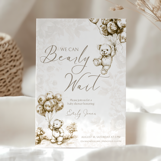 Baby Shower Invitation Bundle - Beige Bearly Wait Toile de Jouy BS36