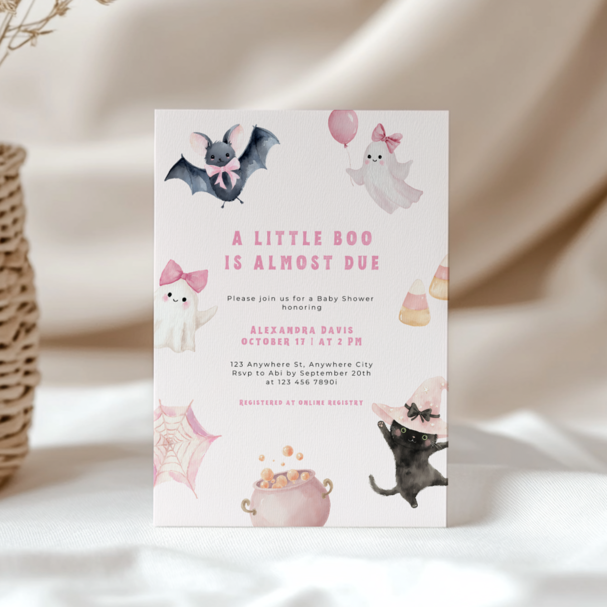 Celebrate the mom-to-be with this charming Halloween baby shower invitation. Featuring soft pink Halloween artwork including ghosts, candy corn, cobwebs, and a magical black cat, this Little Boo Is Almost Due invite brings a playful yet elegant touch to your spooky baby shower. Fully editable and printable for quick and easy setup.
