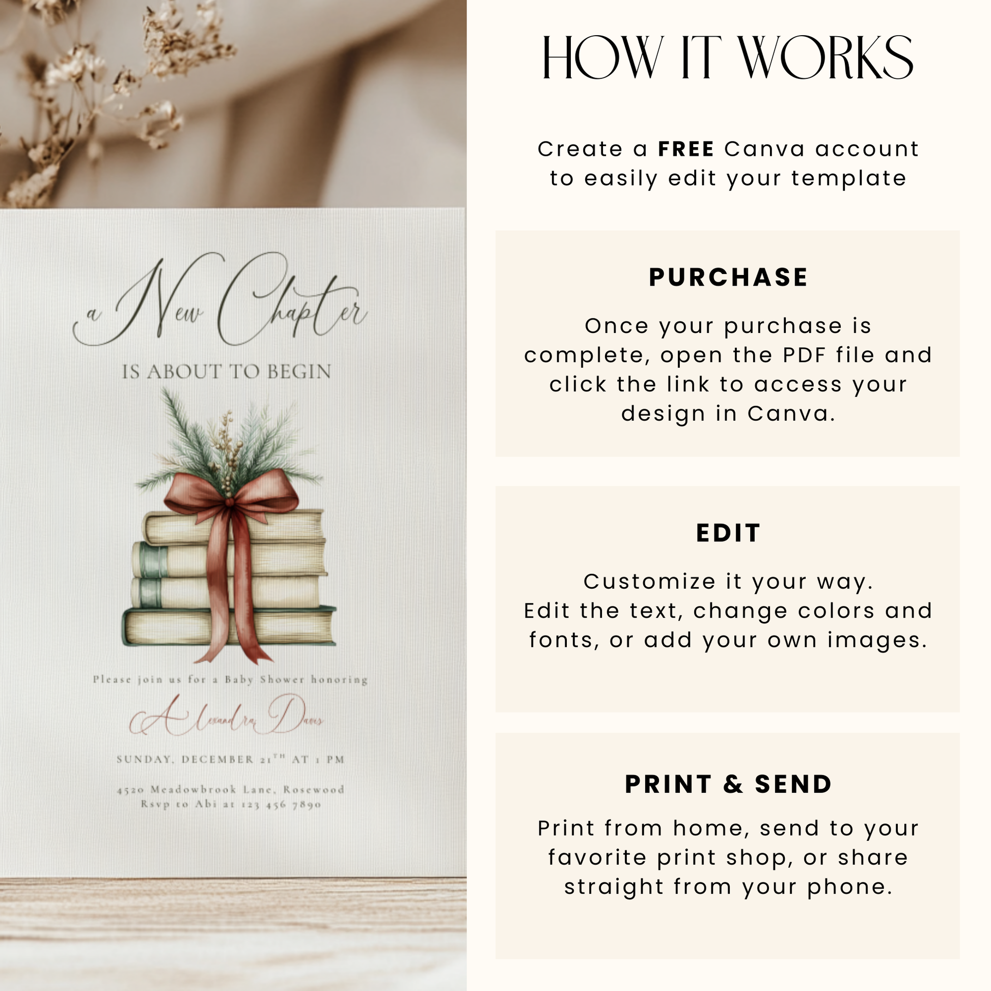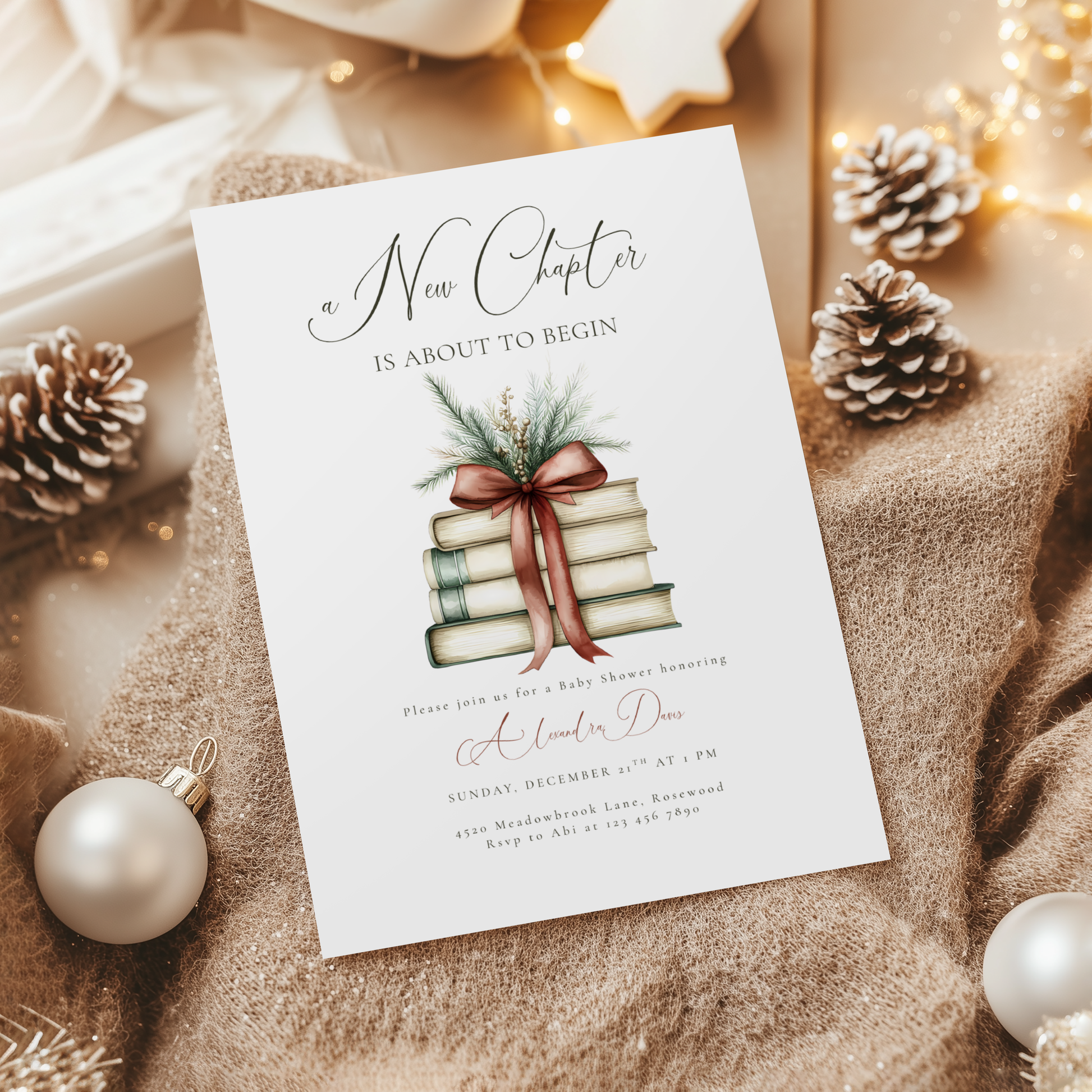 Welcome the next chapter with our elegant Christmas Baby Shower Invitation! This charming design showcases watercolor books tied with a bow, accented with pine branches for a festive touch. Ideal for a winter-themed shower, this template is easy to customize and perfect for honoring the mom-to-be during the holiday season.