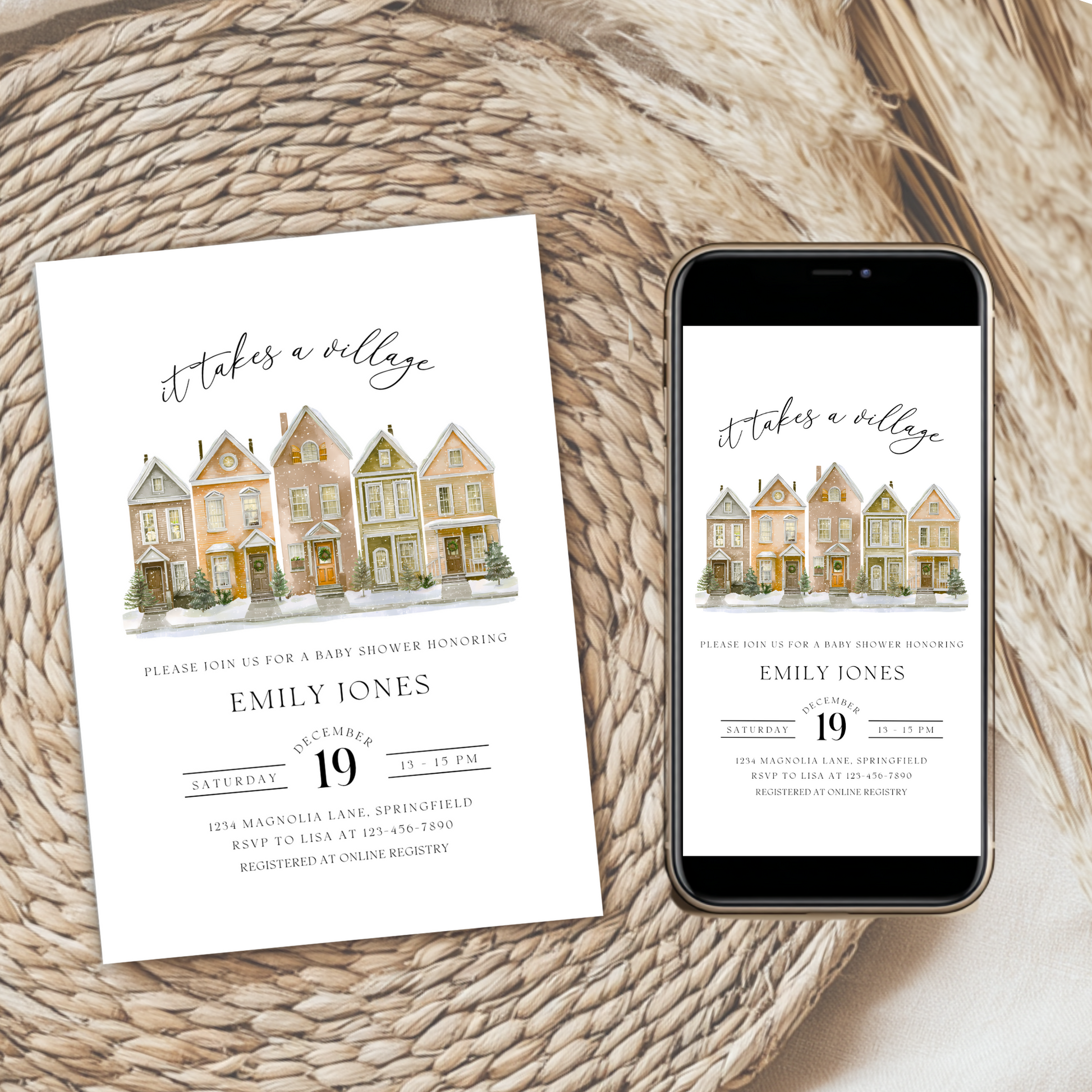 Bring holiday warmth to your baby shower with this Winter “It Takes a Village” Baby Shower Invitation Bundle. Designed with charming snowy houses and a festive village scene, this set includes all the essentials: invitation, mobile version, thank you card, diaper raffle card, and books-for-baby insert. Fully customizable in Canva, it’s an enchanting way to invite loved ones to your Christmas or winter baby shower.