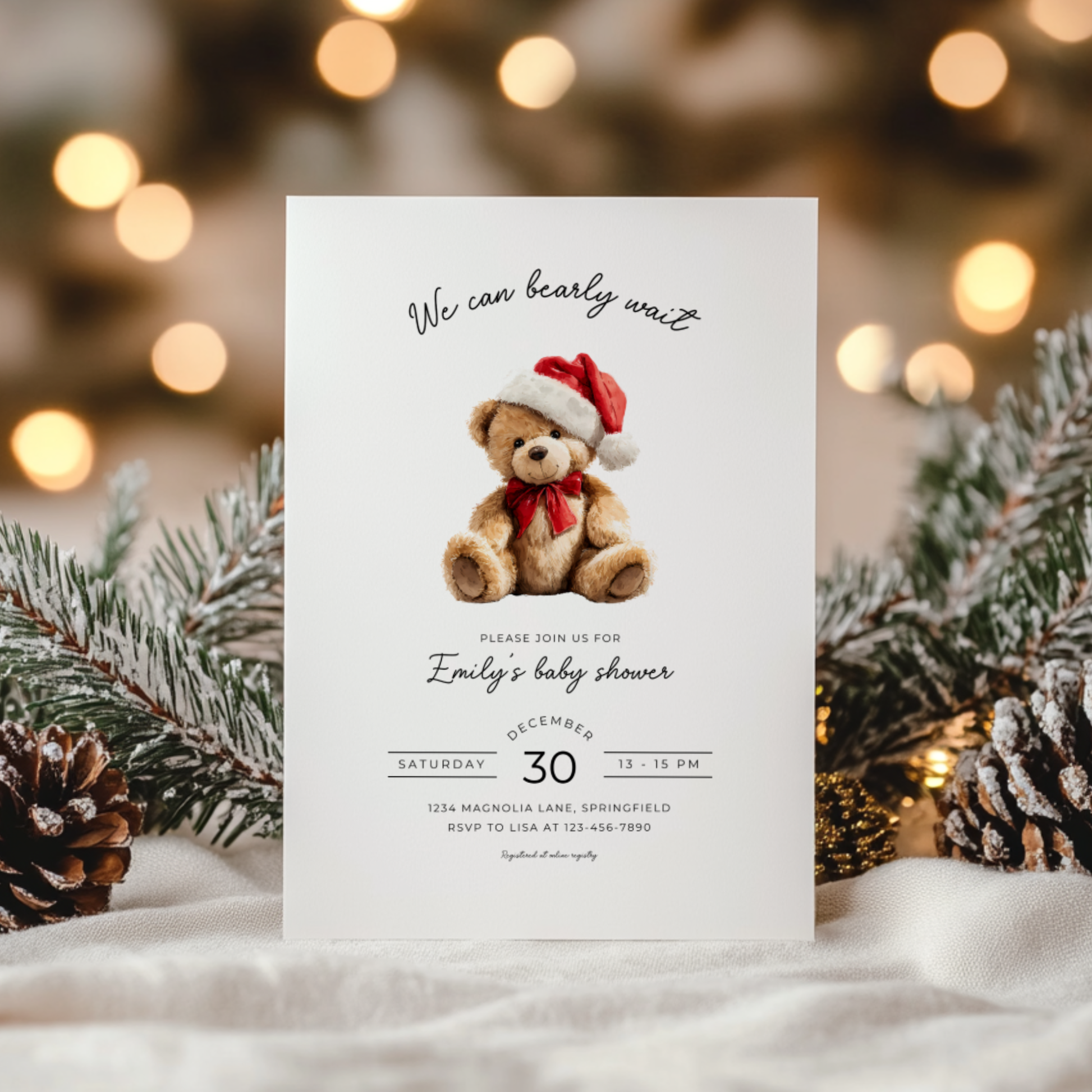 Baby Shower Invitation - Christmas Bear with Santa Hat BS245