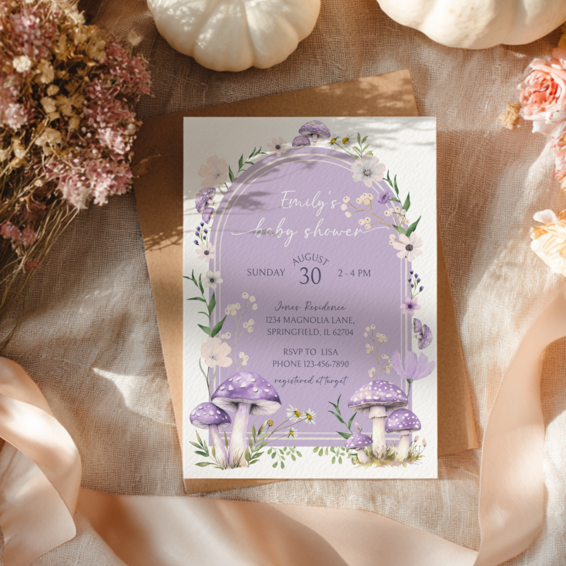 Host a magical woodland baby shower with this charming purple mushroom invitation. The whimsical design includes toadstools, wild blooms, and leafy greens—ideal for a fairycore or forest-themed celebration. Just personalize and print to set the tone for a sweet, nature-inspired shower.