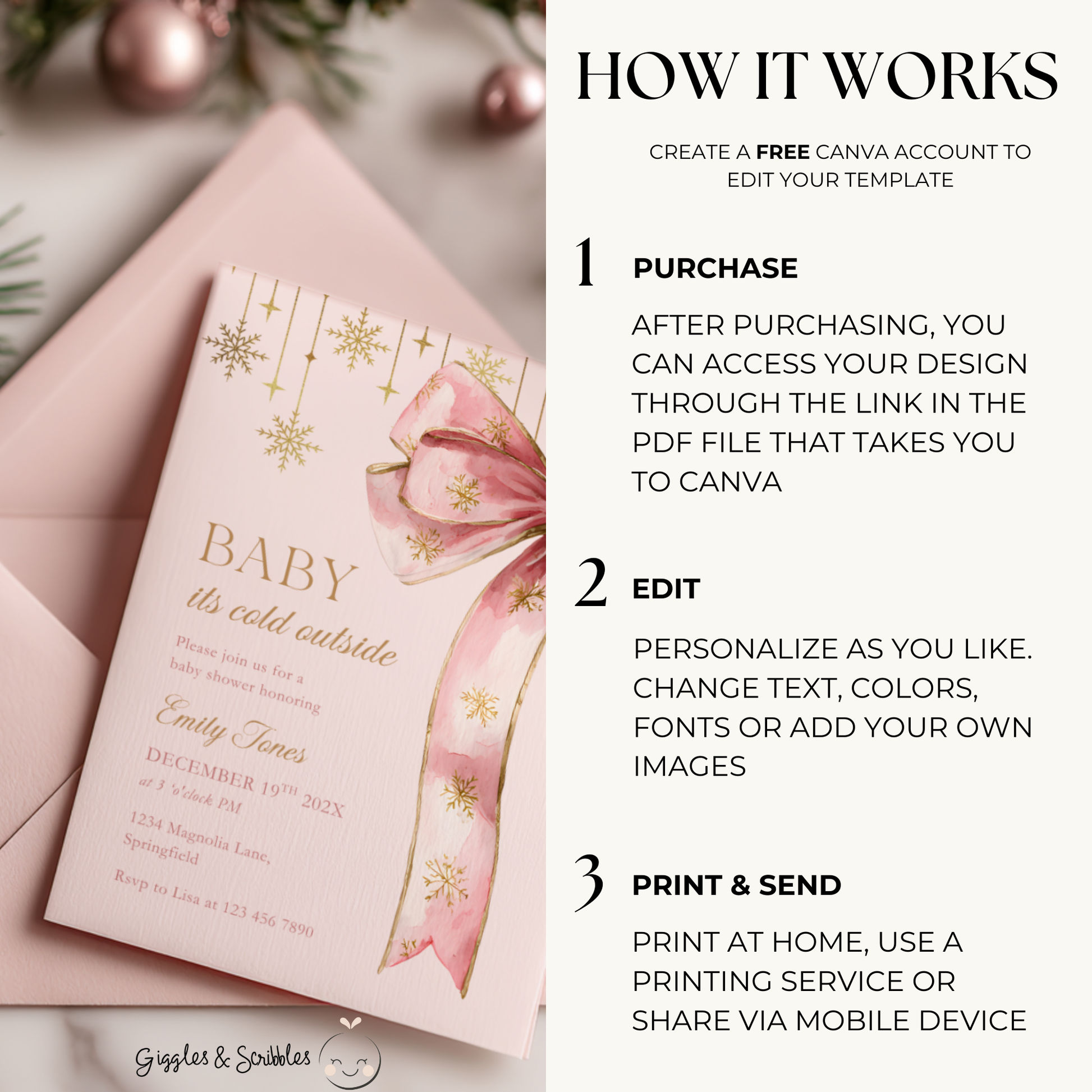 Bring holiday charm to your baby shower with this Baby It’s Cold Outside Invitation. The design highlights a soft pink bow with gold snowflakes, adding warmth and elegance to your winter or Christmas-themed shower. Fully editable in Canva, this printable template makes creating your perfect invitation quick and easy.