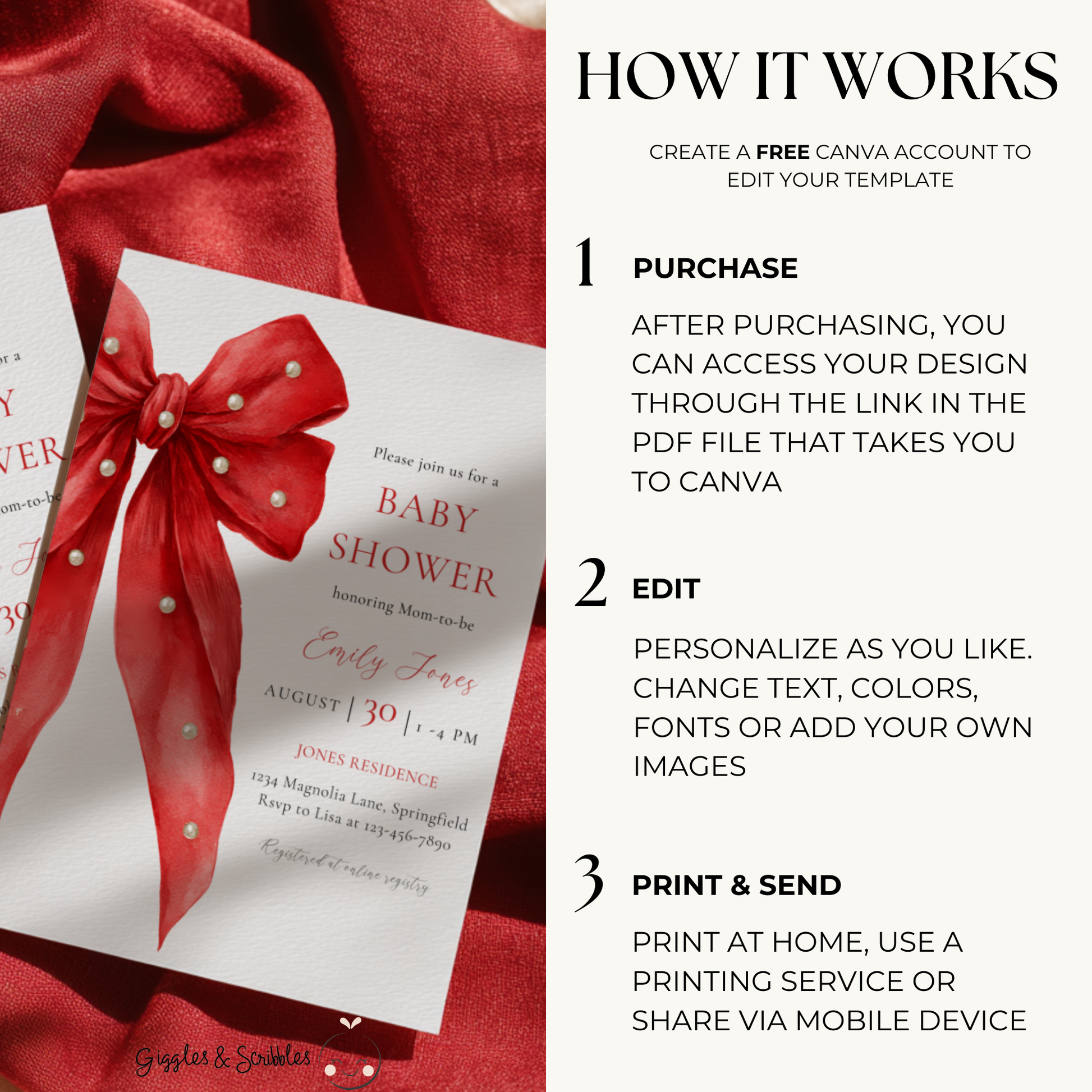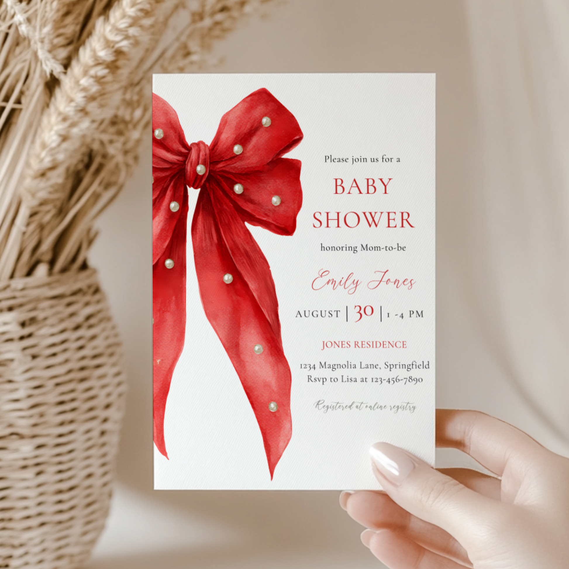 Add a touch of glamour to your celebration with this Red Bow Baby Shower Invitation with Pearls. The design highlights a bold watercolor bow paired with pearl accents for a festive and stylish look. Ideal for a Christmas, winter, or elegant baby shower theme, this editable Canva template is easy to customize, making it the perfect way to invite loved ones to a special day.
