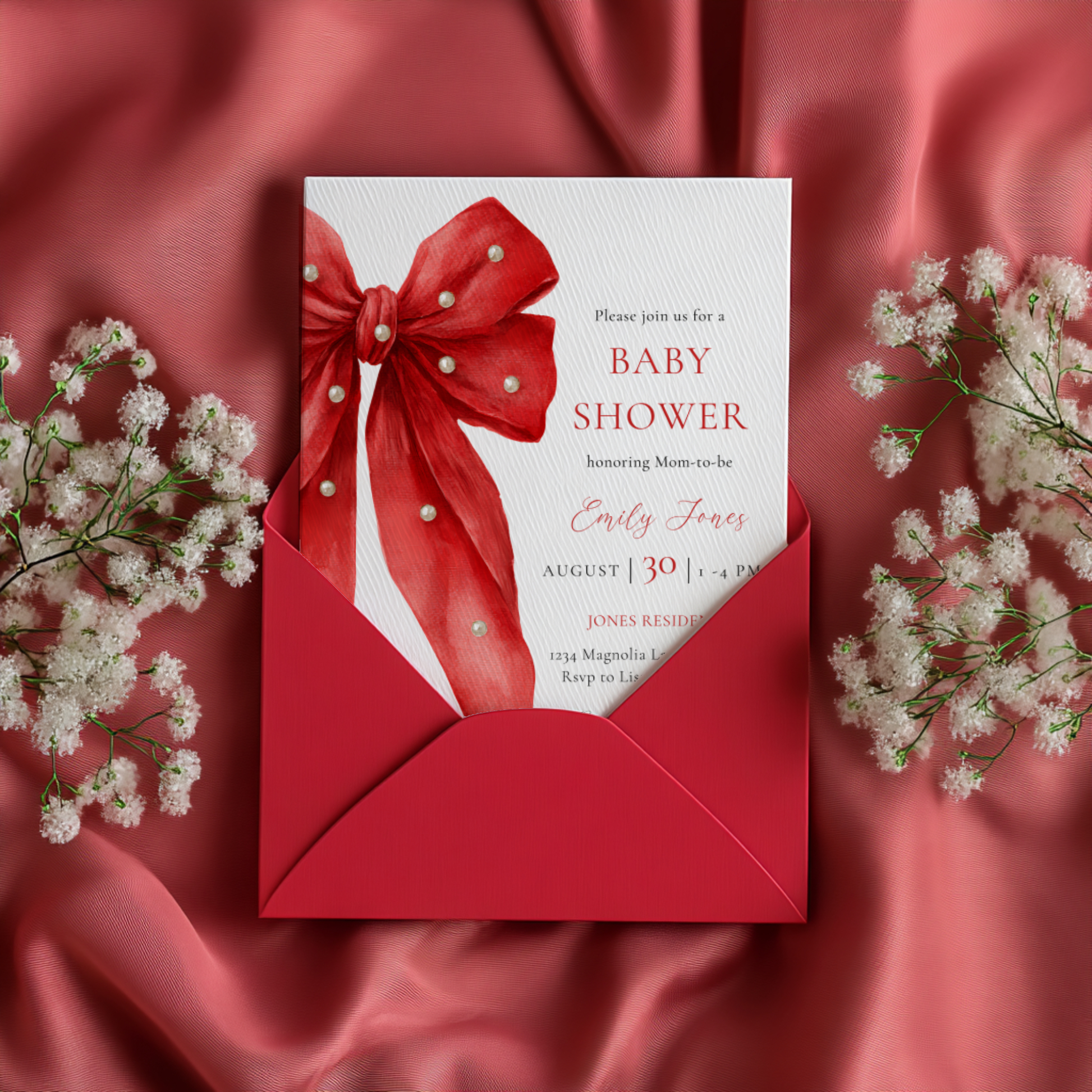 Baby Shower Invitation - Red Bow with Pearls BS240