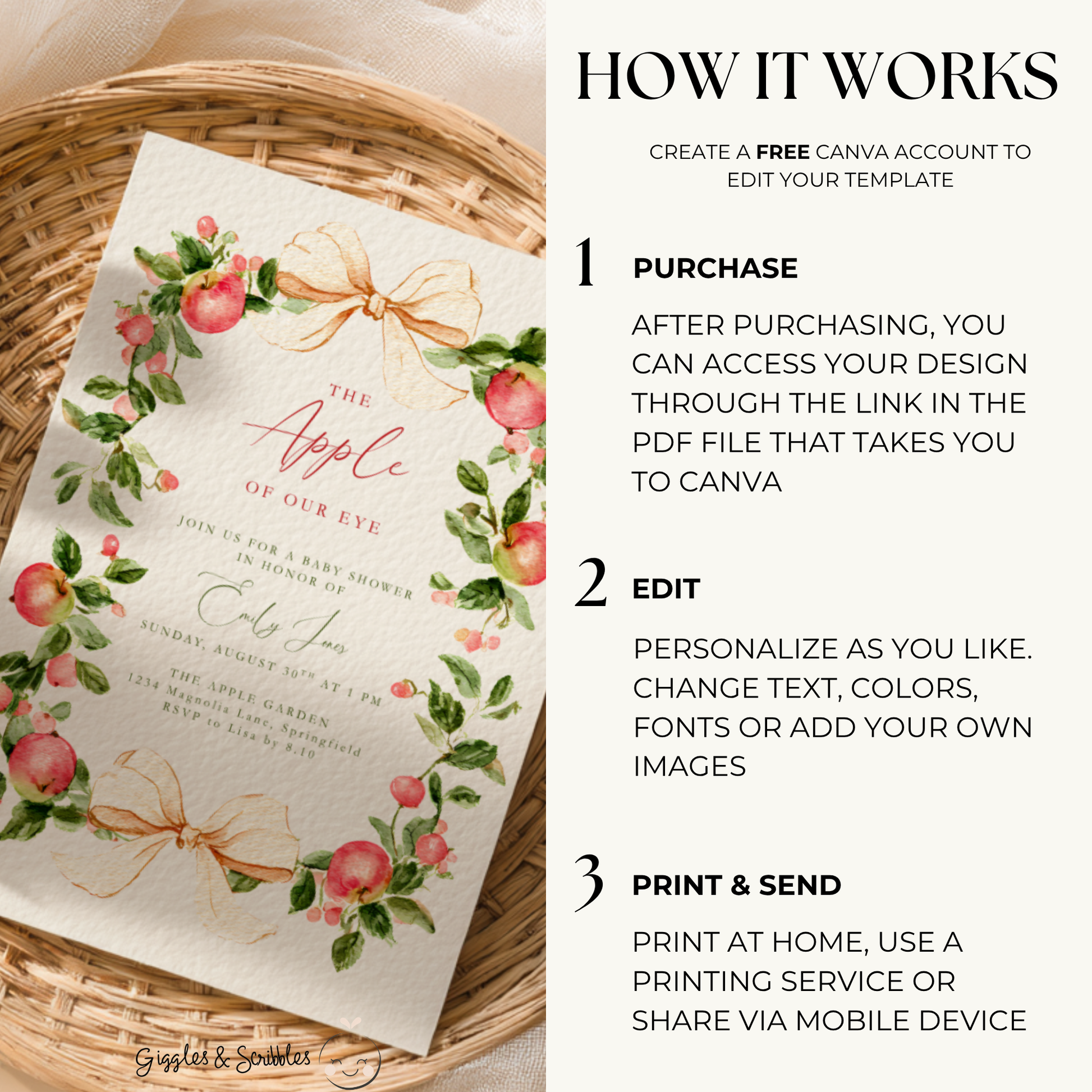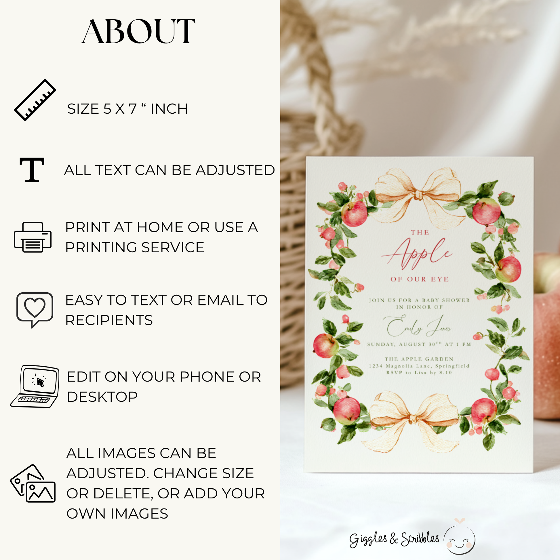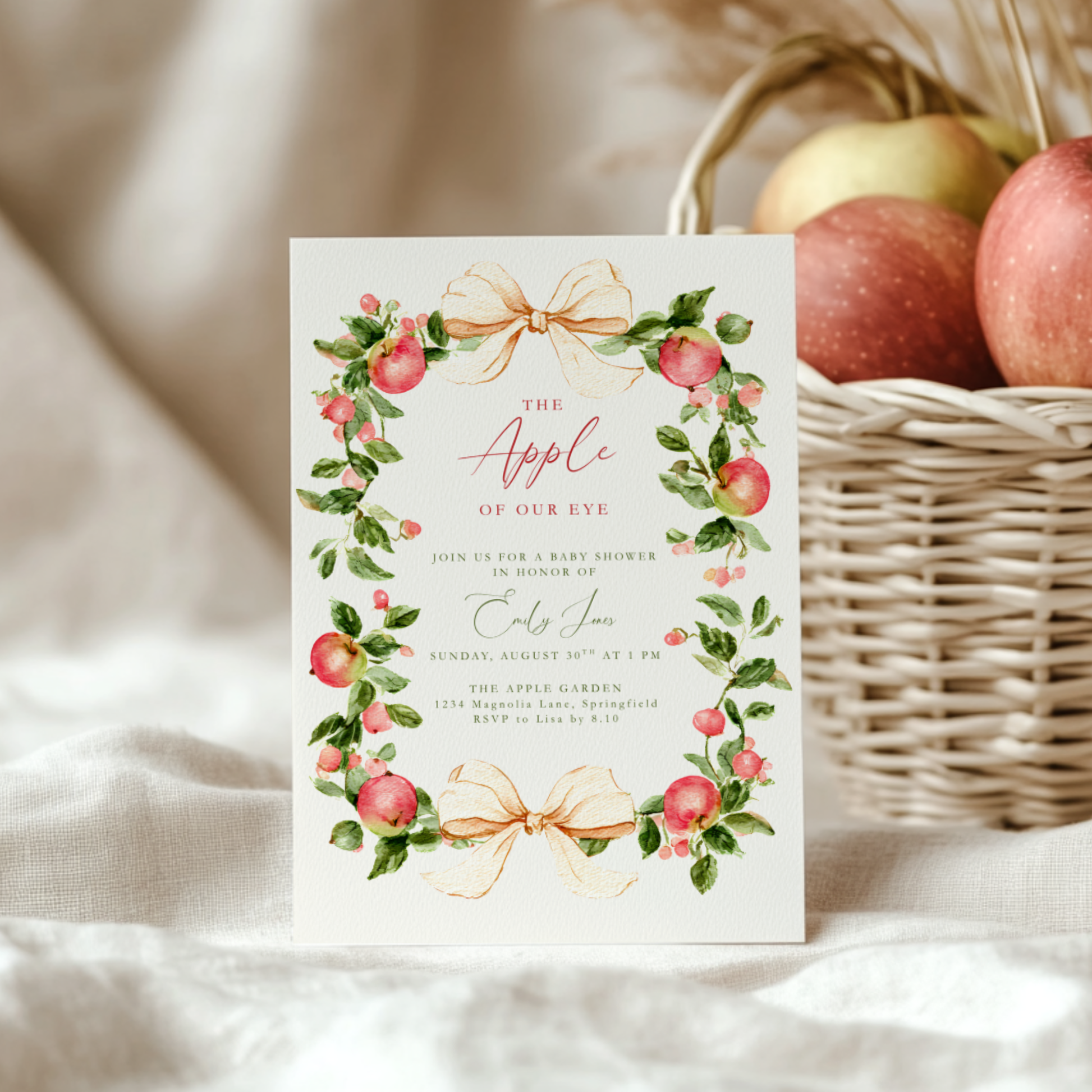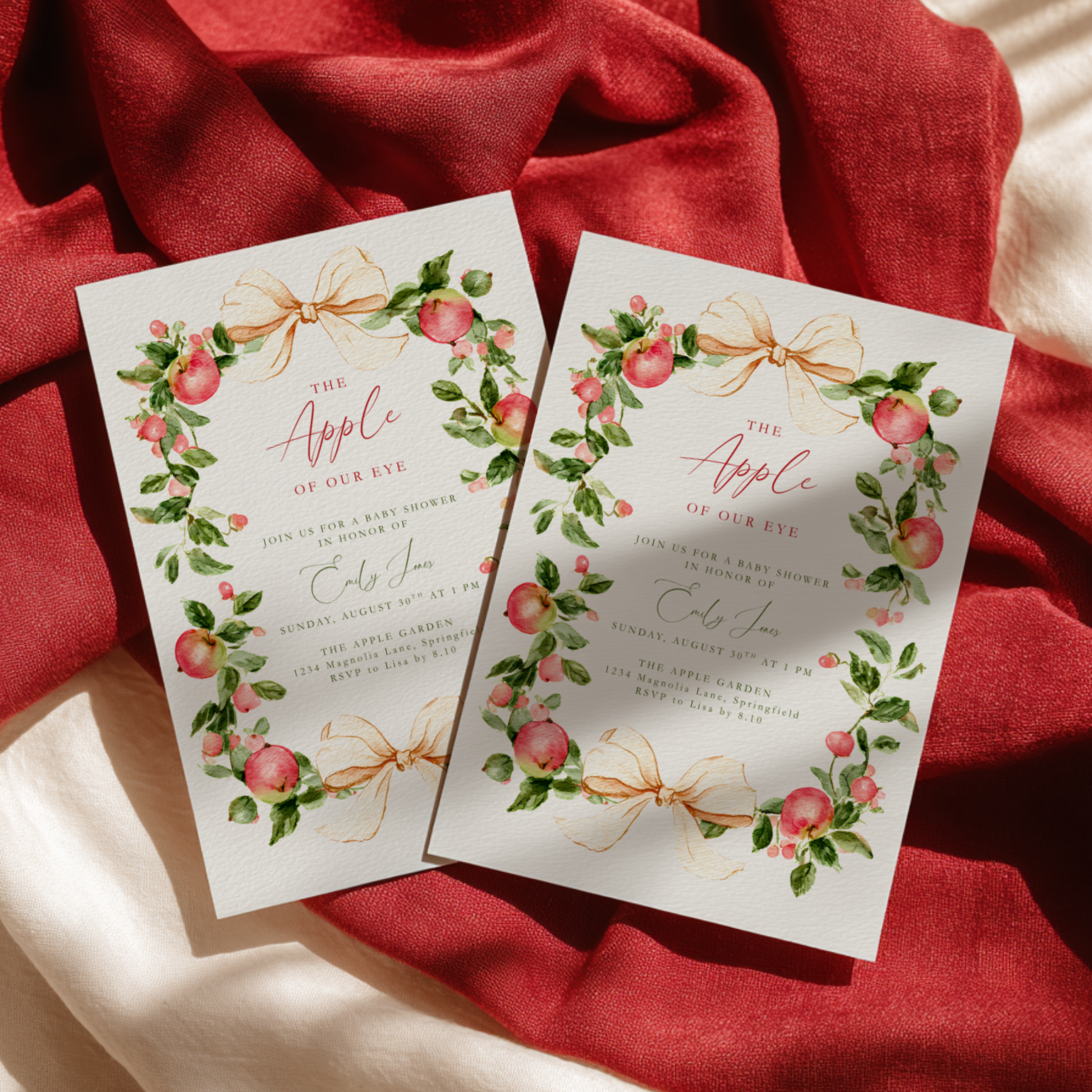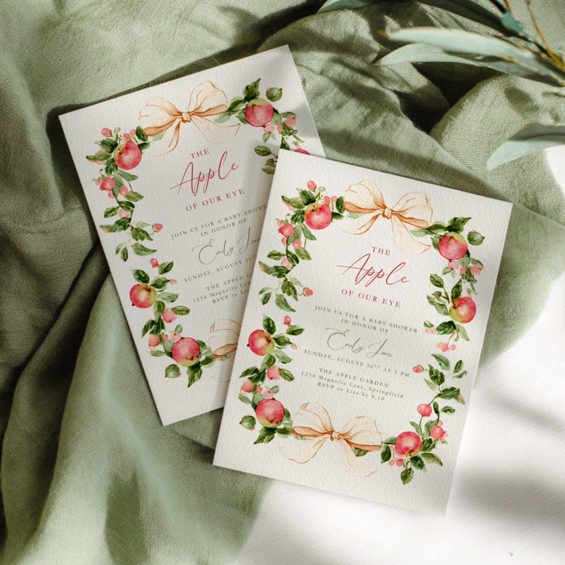 The apple of your eye deserves a celebration full of beauty and grace! This Apple-Themed Baby Shower Invitation features apples, romantic florals, and dainty bows for a soft, vintage-inspired look. Ideal for autumn showers, orchard settings, or rustic garden parties. Personalize it in Canva and print with ease!