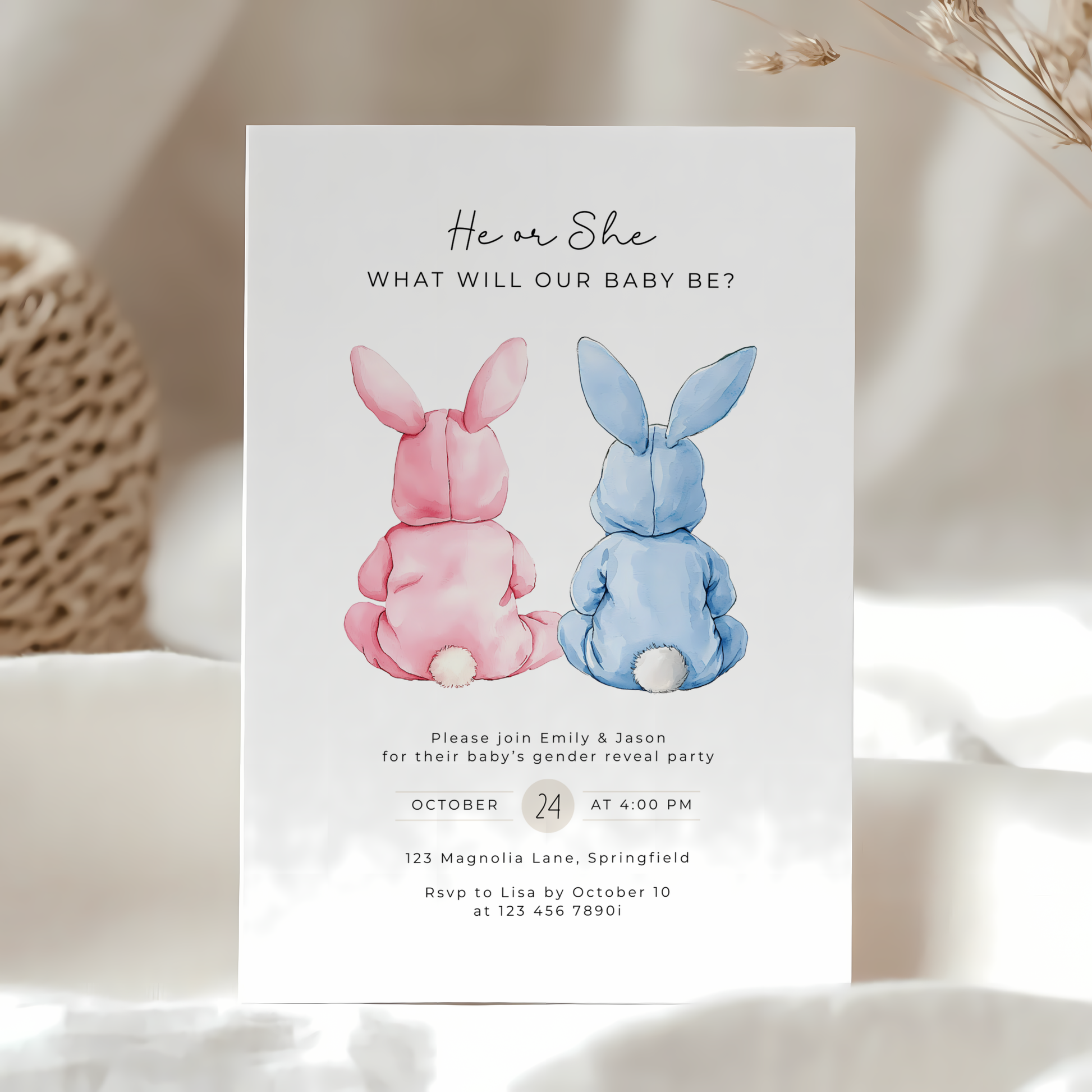 This Bunny Gender Reveal Invitation features sweet watercolor bunnies in soft pink and blue tones, creating a playful and heartwarming design for your gender reveal celebration.