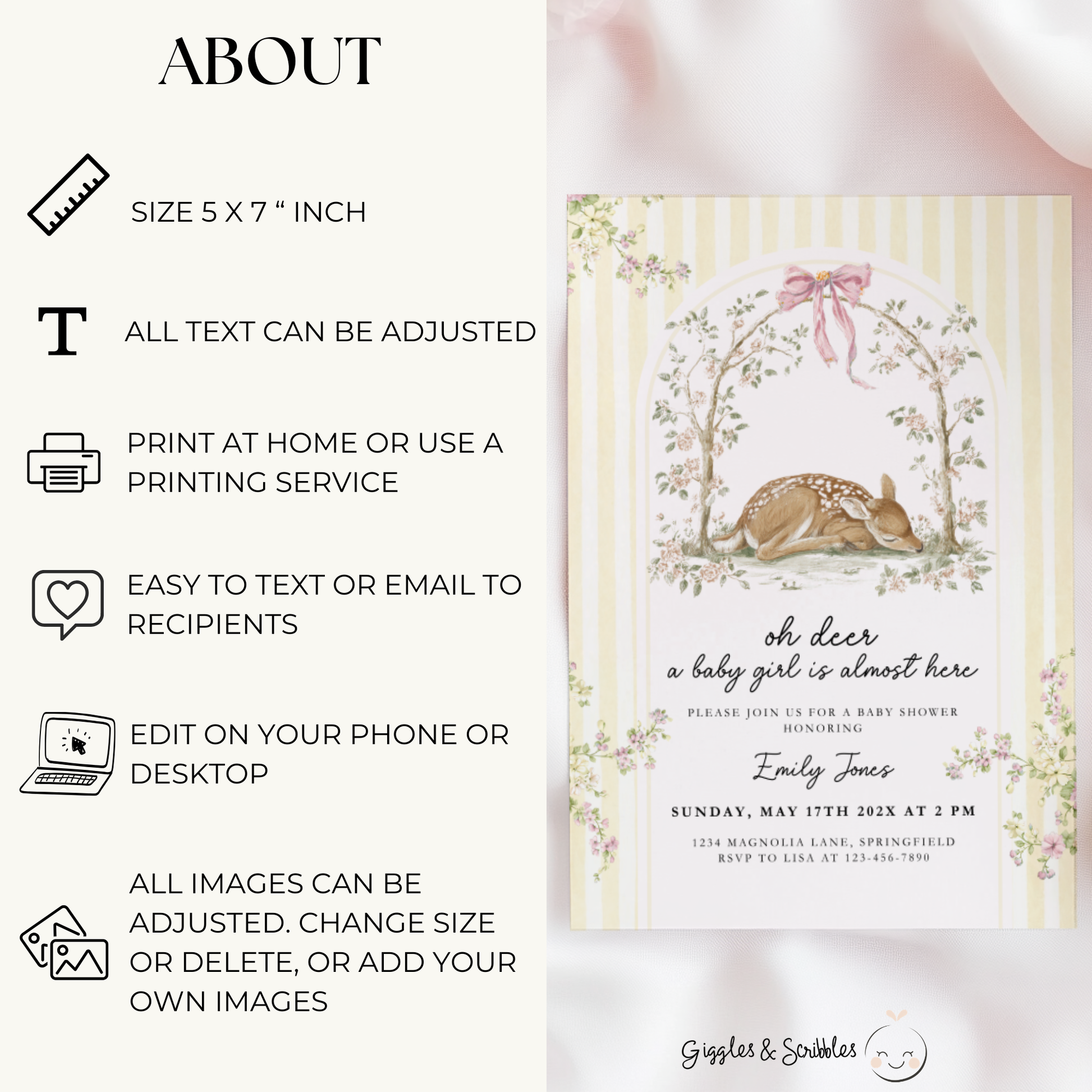 Elegant, timeless, and softly feminine — this printable invitation is ideal for garden, woodland, or classic baby shower celebrations.