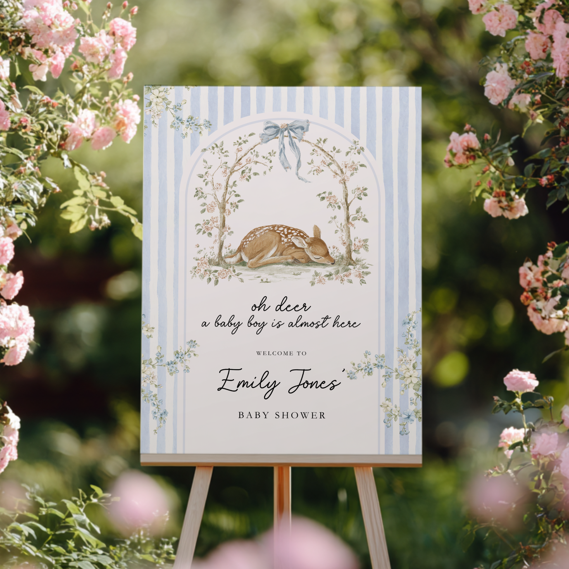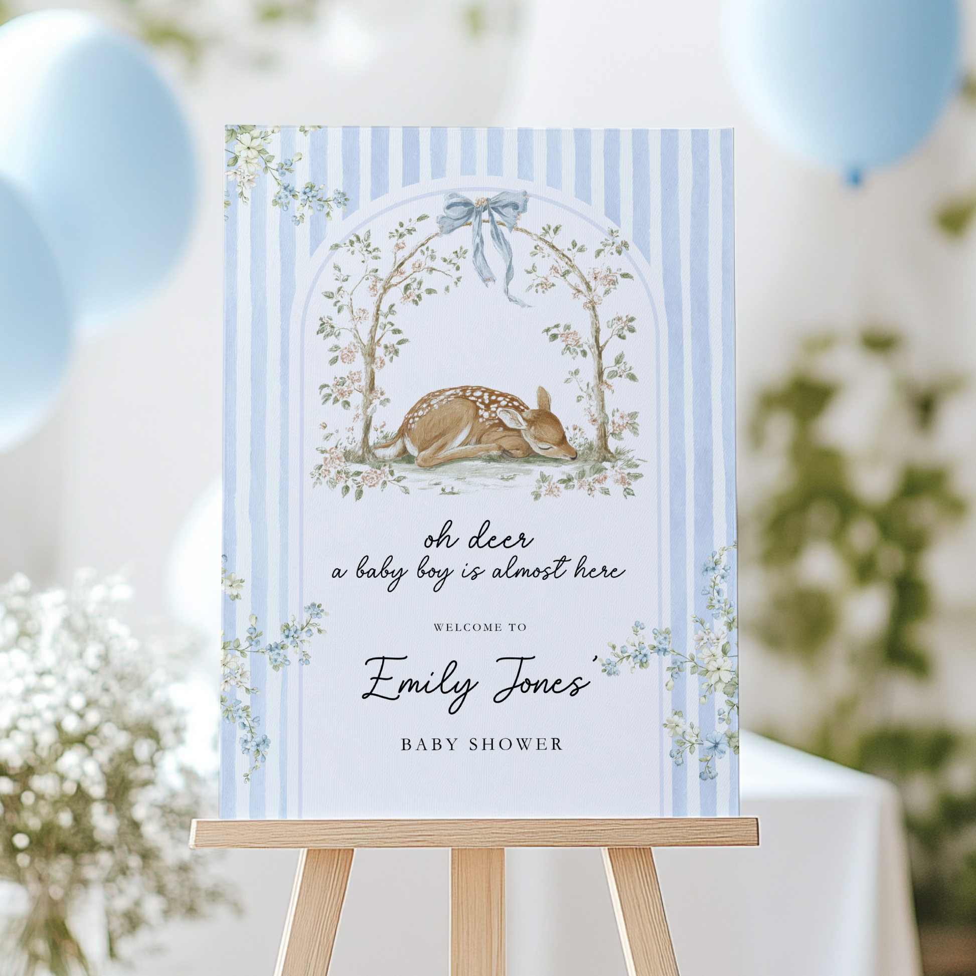 Set a gentle woodland tone for your baby shower with our Oh Deer Baby Boy Welcome Sign. Illustrated with a peaceful watercolor fawn, soft dusty blue florals, and classic striped accents, this design creates a warm and inviting entrance for your guests. Easily personalize your sign in Canva and display it as the perfect finishing touch for your boy baby shower.