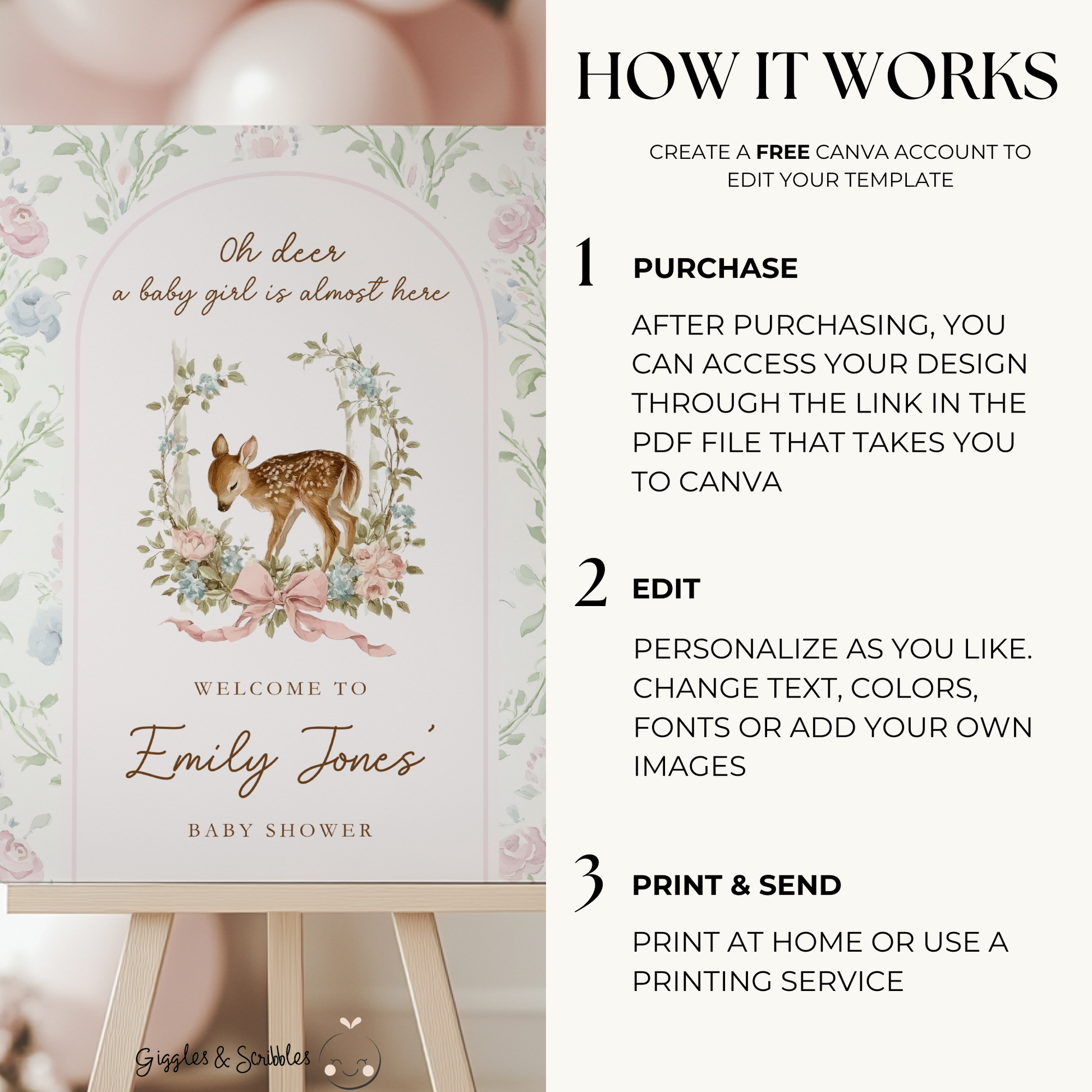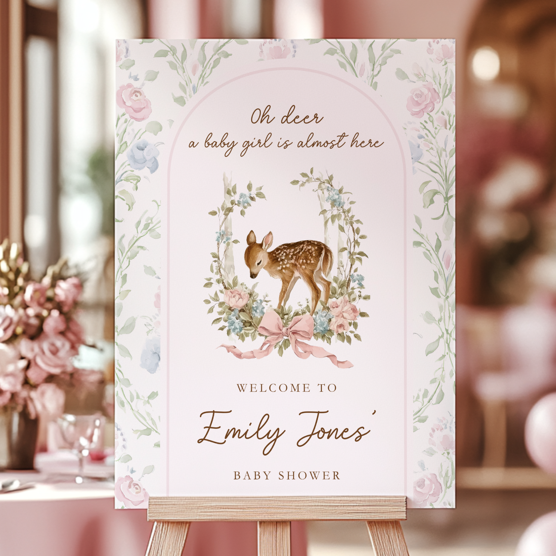 Set a sweet and elegant tone for your celebration with our Oh Deer Baby Shower Welcome Sign. This soft pink woodland design features a delicate watercolor fawn surrounded by florals and gentle greenery—perfect for a baby girl shower. Easily customize your sign in Canva and display it at your event to create a warm, enchanting welcome for your guests.