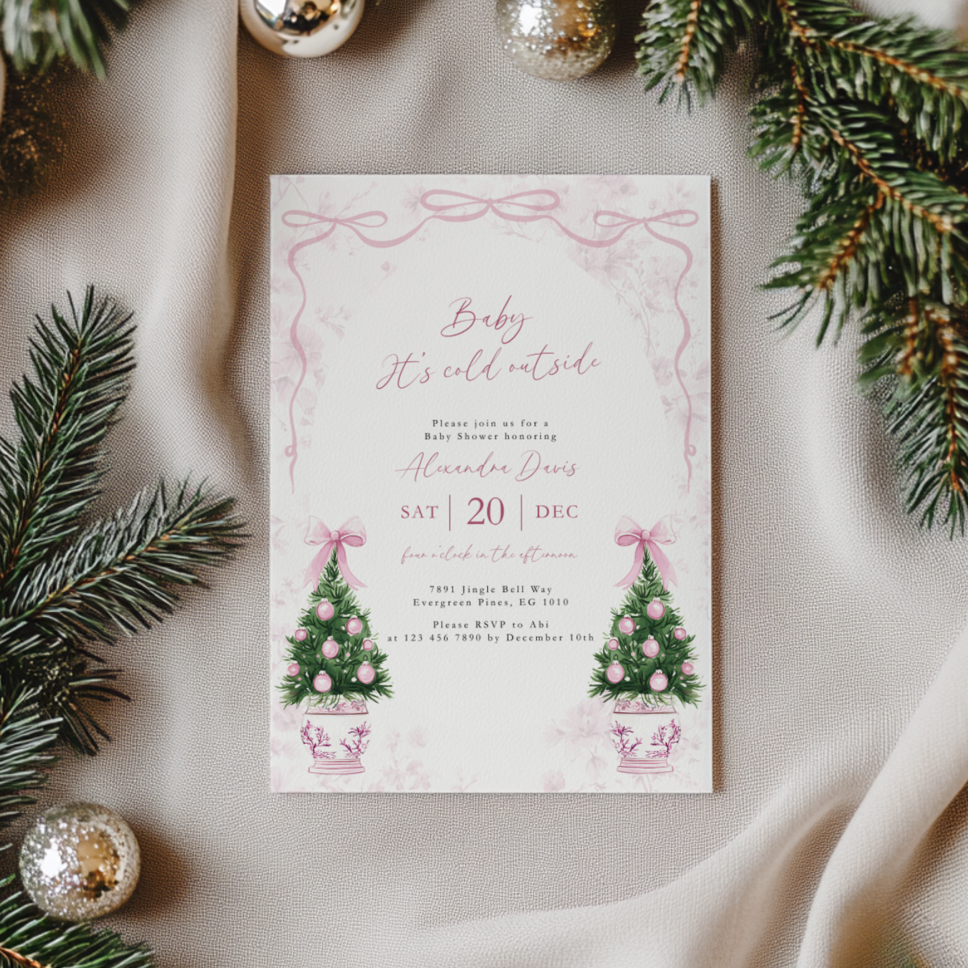 Celebrate your little one with this pink Coquette Christmas Baby Shower Invitation. Designed with dainty bows, decorated trees, and a festive Baby It’s Cold Outside theme, this digital template is fully editable and easy to use. Ideal for a stylish holiday baby shower with a soft and feminine touch.