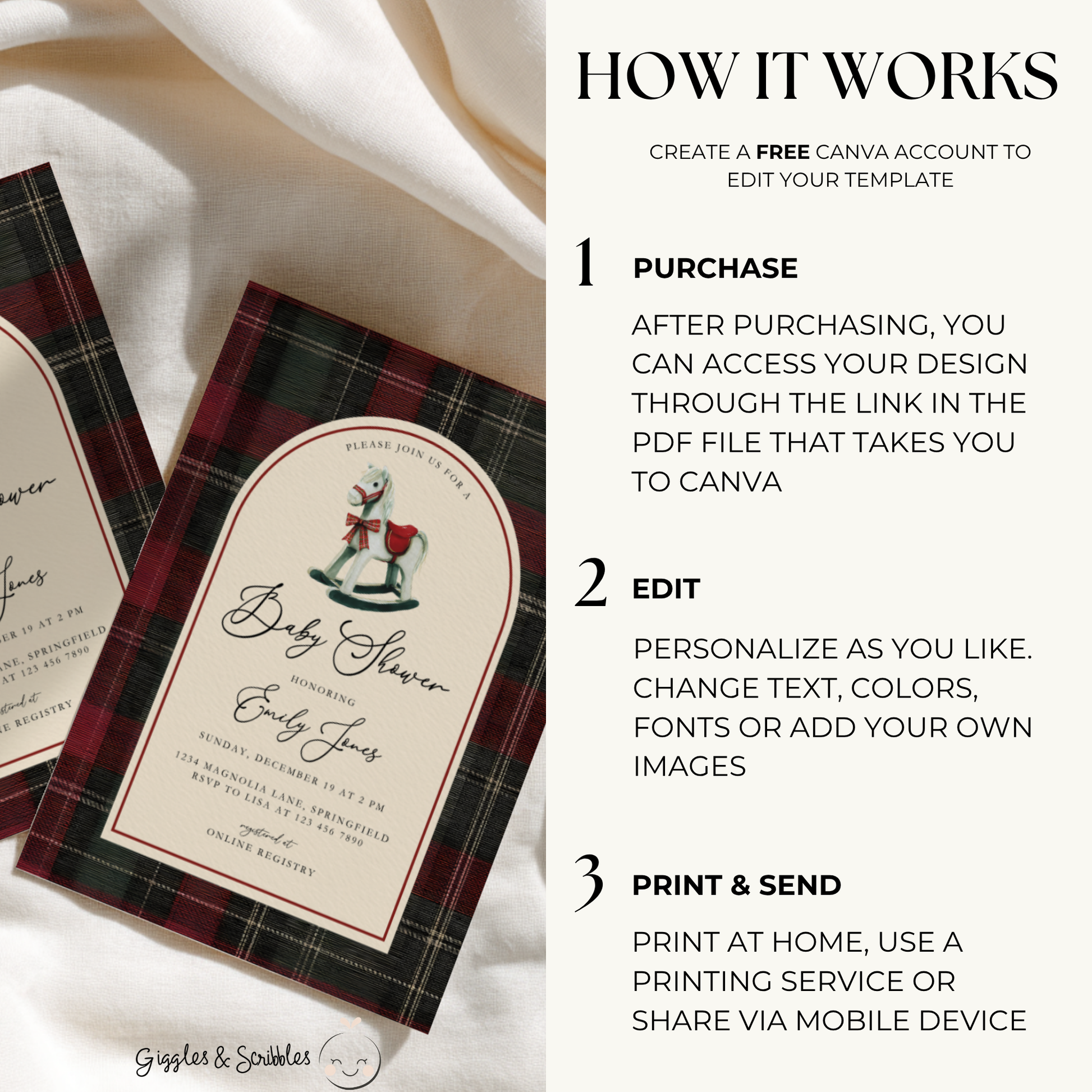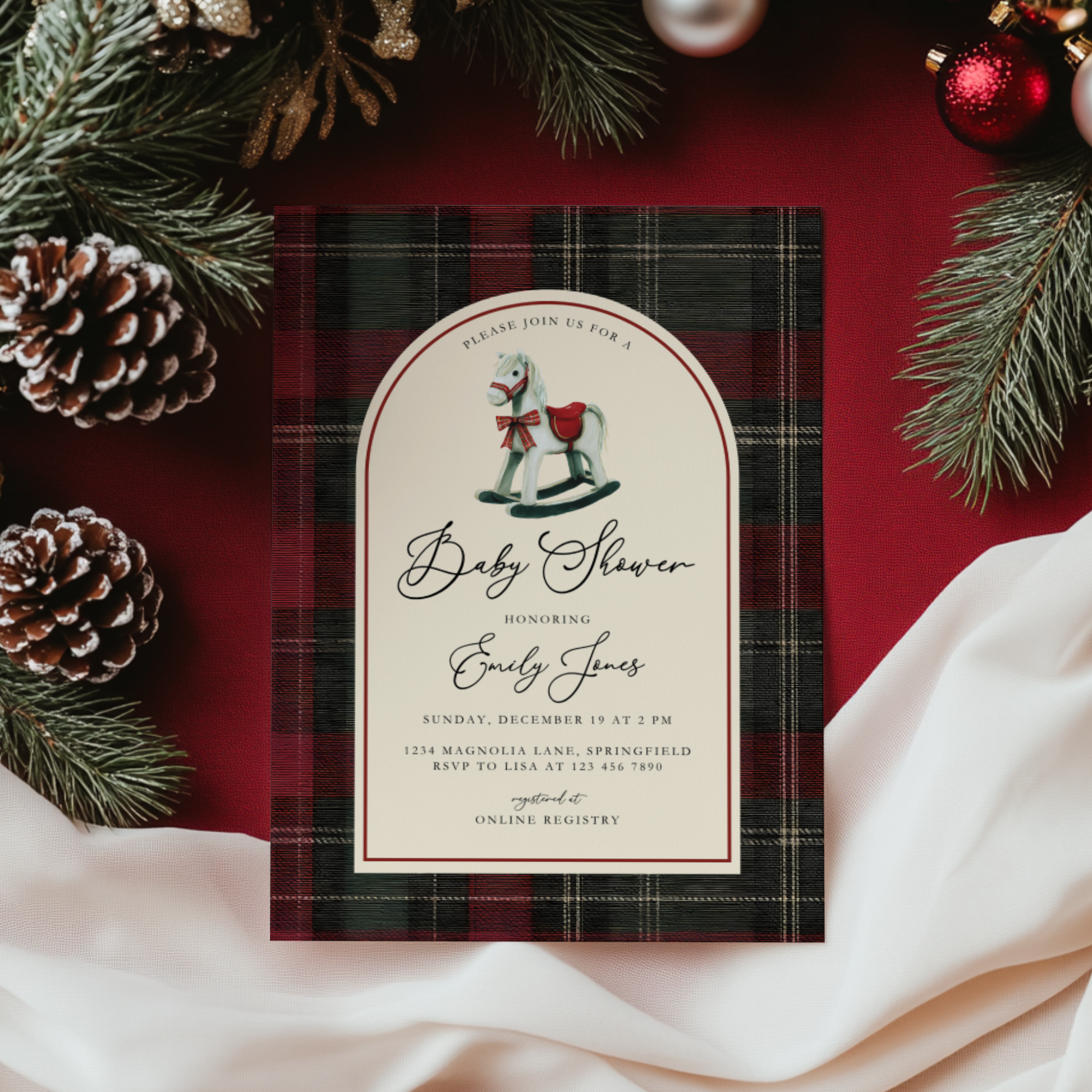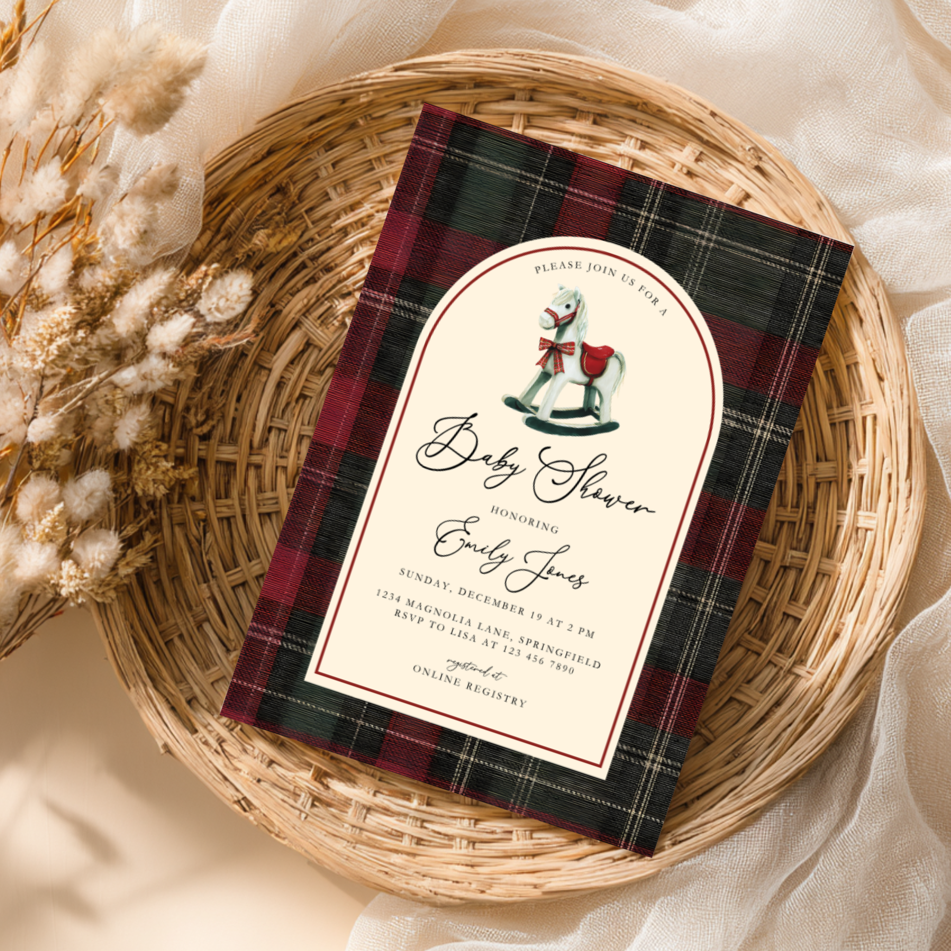 Bring classic holiday charm to your celebration with our Rocking Horse Baby Shower Invitation. Designed with deep red and green plaid and a beautifully illustrated wooden rocking horse, this invitation blends tradition and warmth — perfect for a winter or Christmas baby shower. Easily customize your design in Canva to create an elegant, heartfelt invitation for your special day.
