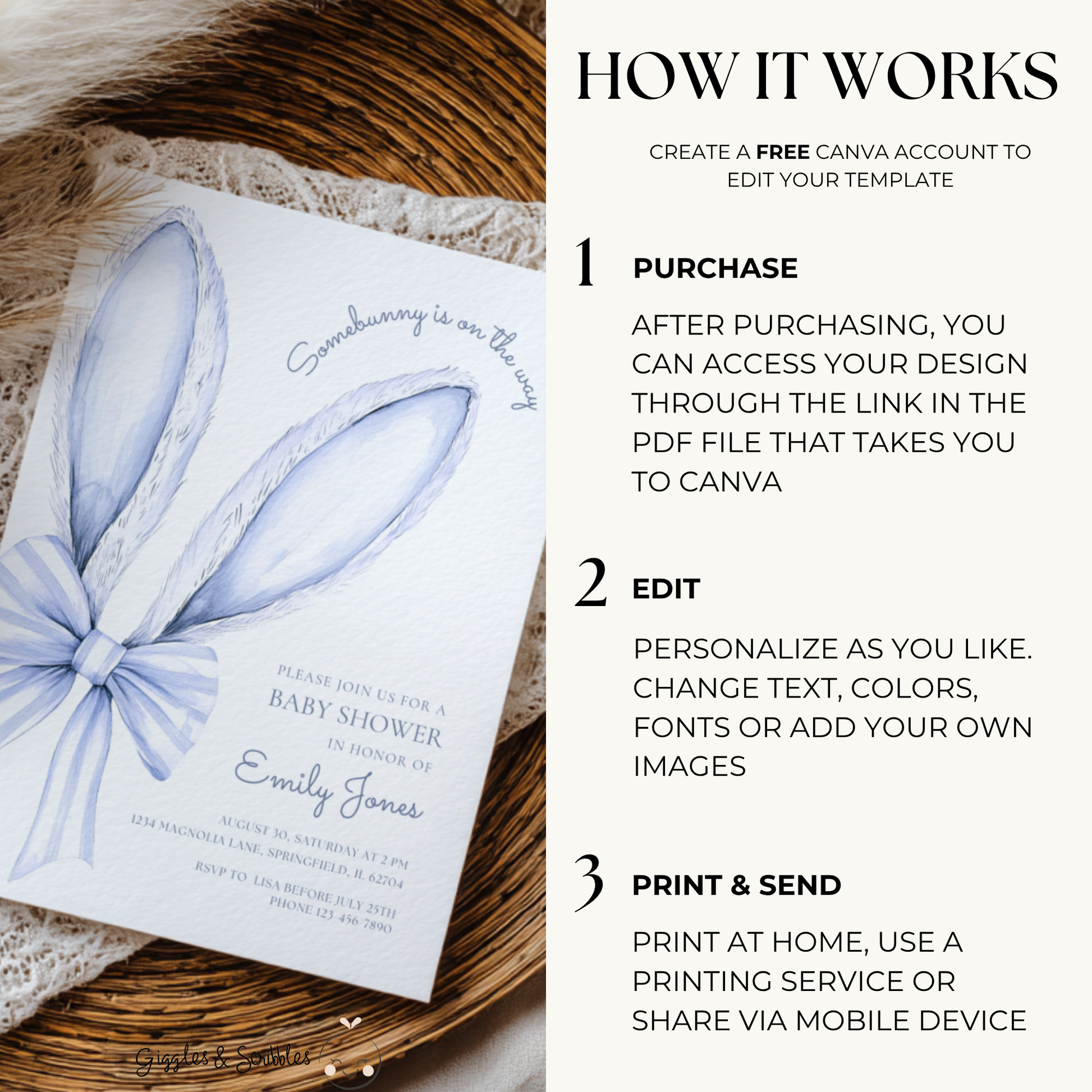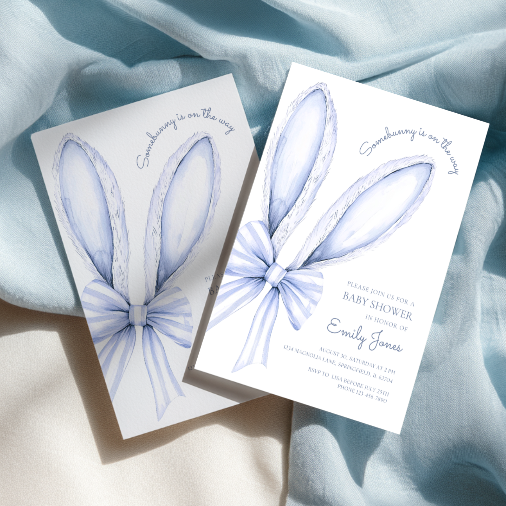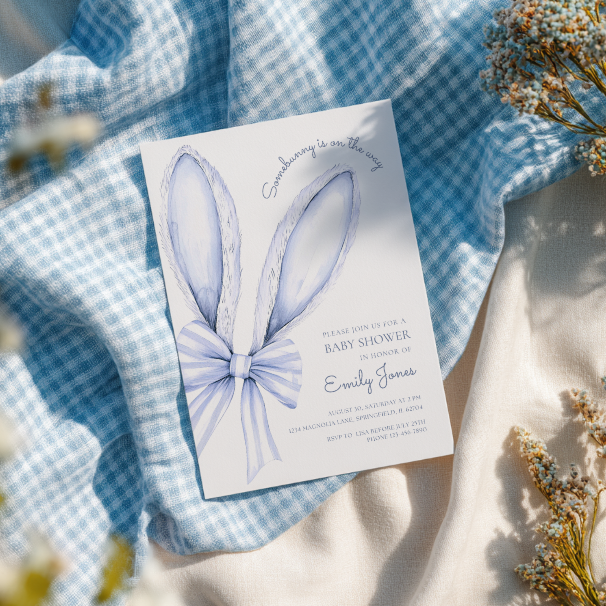Welcome loved ones to a sweet and timeless celebration with our Some Bunny Is On The Way Baby Shower Invitation. Designed with hand-painted watercolor bunny ears and a soft blue bow, this invitation brings gentle elegance to your spring or bunny-themed baby shower. Customize effortlessly in Canva to create a beautiful, heartfelt invitation that sets the tone for your special day.
