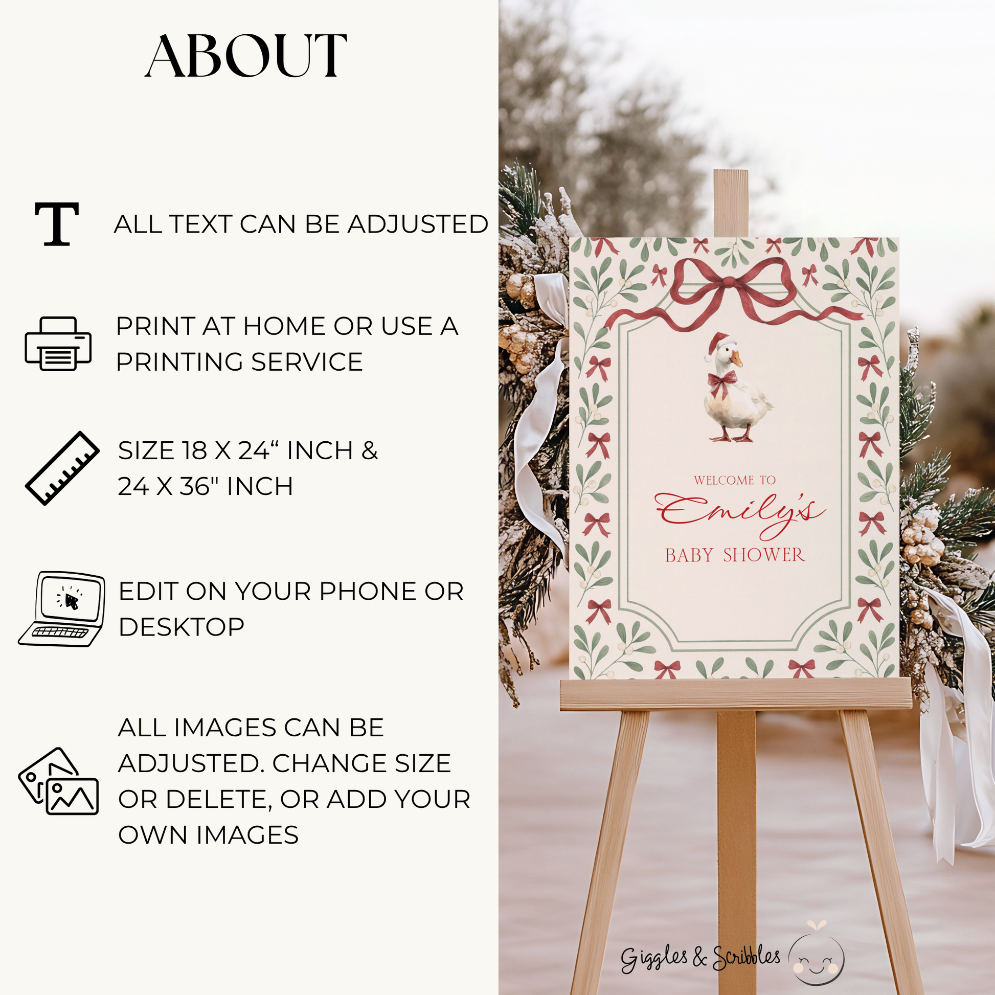 Add a touch of vintage holiday charm to your celebration with this Christmas Goose Baby Shower Welcome Sign.